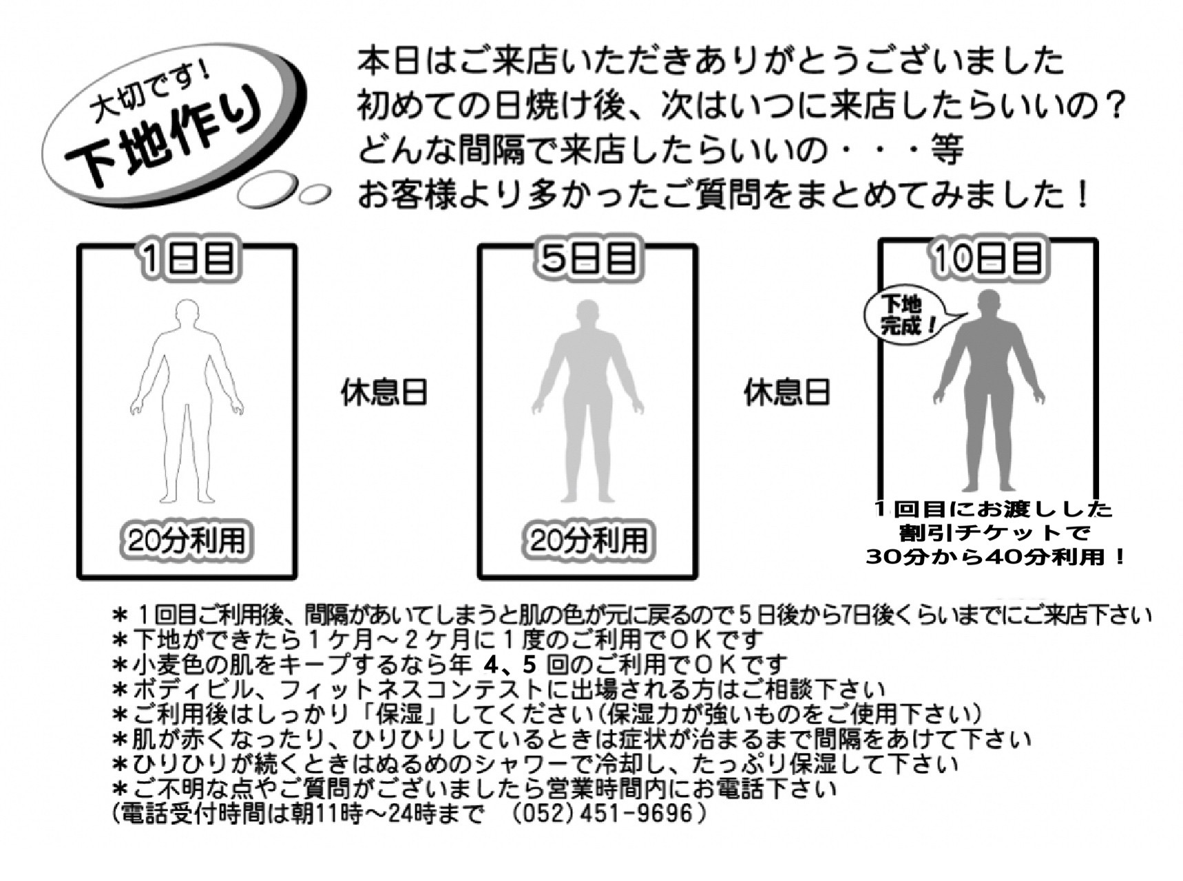 - 1回目ご利用後、間隔が開くと肌の色がすぐ元に戻るので5日後から7日後位までにご来店いただき、下地ができたら年4、5回のご利用でOK!